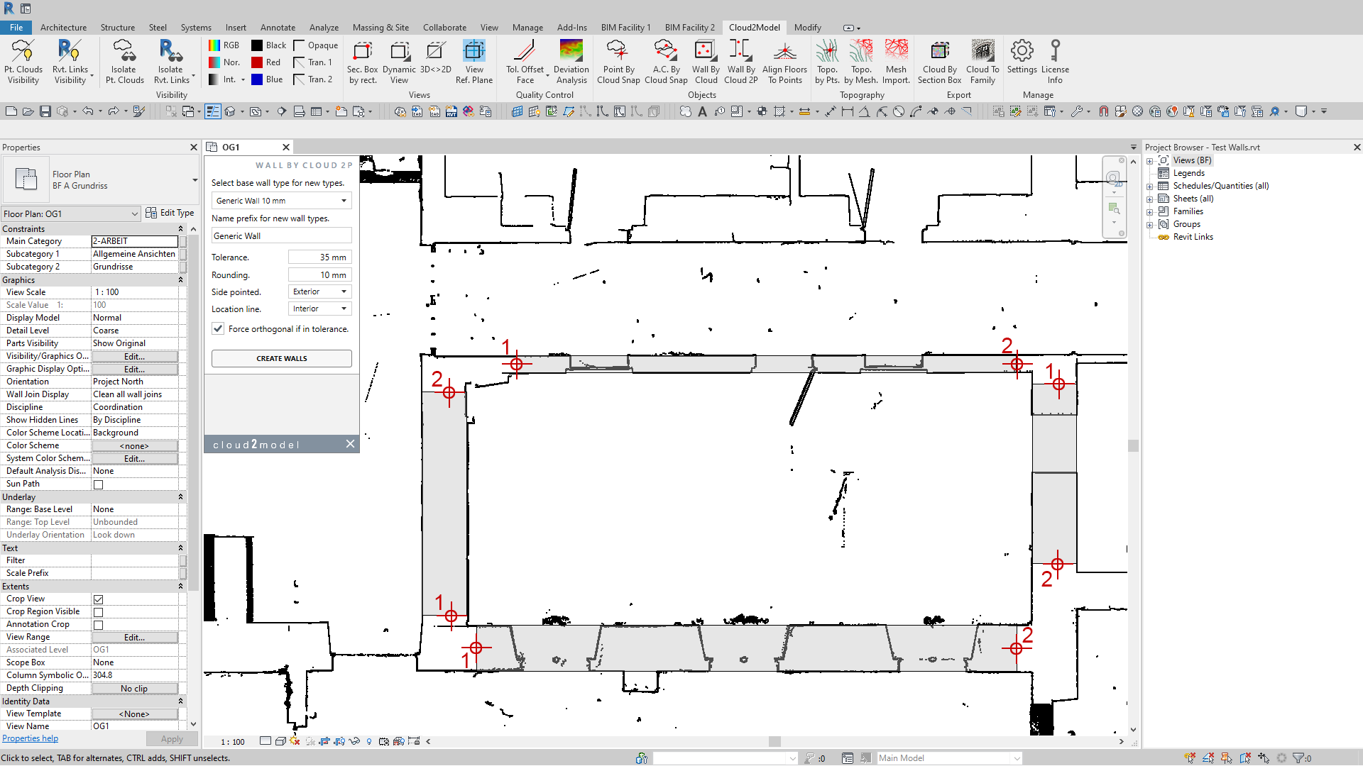Leave cloud2model to do the hard job in complex plan layout. Instant creation of perfect matching walls with just two loose clicks over the point cloud. And with full control of the wall and wall type properties.